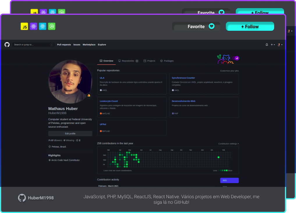 Projects such as the Personal Budget App (App for personal control of finance), using Modern JavaScript (ECMAScript 2015 - ES6) and Object Orientation, Online Store Database Project (Implementation of a virtual store database), using MySQL, Address Search App (performing HTTP requests via XMLHttpRequest for API's), using Ajax, among others.